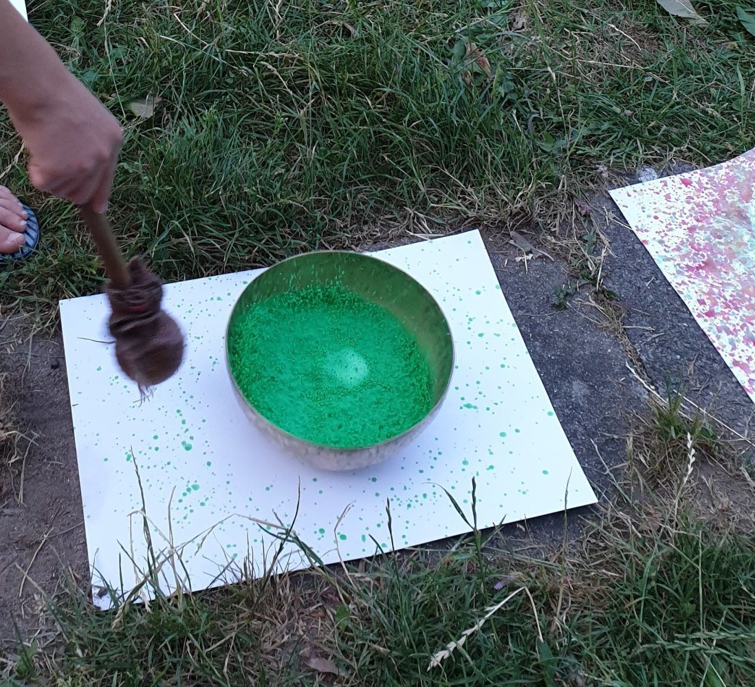 Aber auch experimentell und künstlerisch kamen sie zum Einsatz. Mit Farben gefüllt und auf große Papierbögen gelegt, schlugen die Kinder die Klangschalen an. So entstanden viele kleine bunte Tropfen, die aus den Schalen herausspritzten und ein Mandala bildeten.